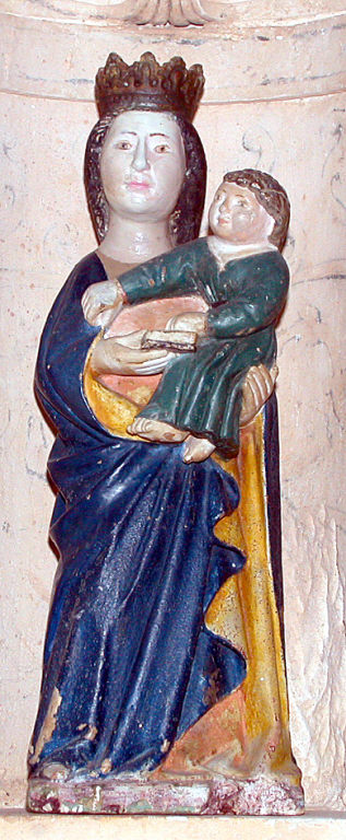 Escultura de vulto, de pedra calcária, policromada, representando a Virgem Maria com o Menino Jesus, sob a invocação de Nossa Senhora da Tojeirinha. A Virgem apresenta-se de corpo inteiro, de pé, e possui cabelos castanhos e com coroa aberta , composta por florões e pedúnculos no nível superior. A figura, cujo joelho direito está ligeiramente fletido, traja túnica roçagante de tom alaranjado e manto azul e amarelo, colocado sobre os ombros, que se encontra ritmado por pregas diagonais e que lhe envolve o corpo. A Virgem Maria segura o Menino com o braço esquerdo e apresenta na mão direita um livro fechado. O Infante traja túnica verde, cingida na cintura e com decote em " V". Pousa a mão direita sobre a Virgem e a esquerda sobre o livro. A escultura encontra-se colocada sobre base rectílinea.