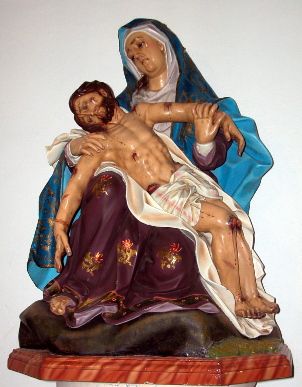 Escultura de vulto, de madeira policromada, representando a Virgem da Piedade, sobre a invocação da Nossa Senhora da Piedade. A Virgem, sentada sobre uma rocha, possui as maçãs do rosto acentuadas, marcado por lágrimas, e direciona o seu olhar para o corpo morto de Cristo. A imagem mariana apresenta o joelho esquerdo mais fletido, traja coifa branca, drapeada e que deixa vísivel um cacho de cabelo castanho ondulado, e túnica roçagante, de tonalidade violeta, ornada com elementos florais, dourados e vermelhos, e orlada a dourado. O manto, em tons azuis, envolve a Virgem Maria, e encontra-se decorado com elementos vegetalistas dourados e pedras vermelhas incrustadas. A imagem ampara no seu regaço a escultura de Cristo morto, colocado sobre o sudário branco. A figura cristológica apresenta cabelos e barba castanha, encontra-se desnudada, possuindo apenas cendal na cintura, e apresenta o corpo marcado por chagas abertas ensanguentadas. A representação de Cristo está disposta obliquamente, formando uma estrutura piramidal com a Virgem Maria. A escultura está assente sobre base rectílinea, marmoreada em tons térreos.