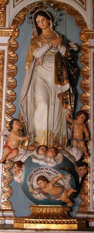 inteiro, que ostenta uma faixa com a legenda "ToTa Pulchra es MARIA". A
